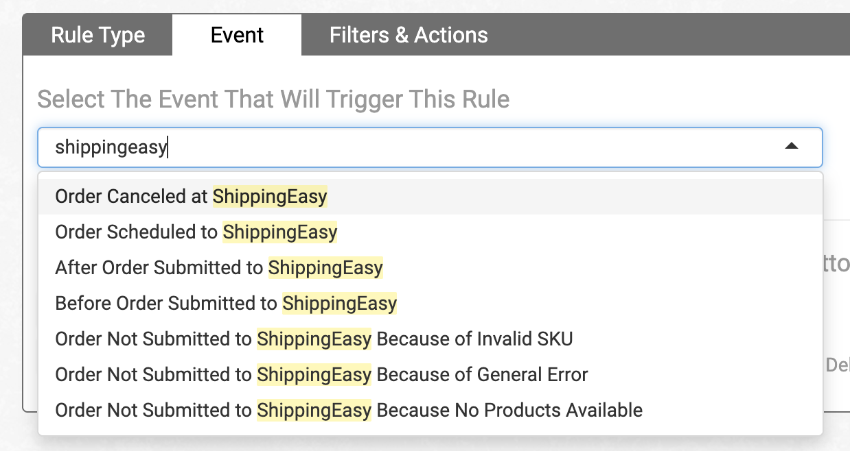 The following events are specific to ShippingEasy. To find them, type shippingeasy in the Event dropdown menu in the Rule Builder:
