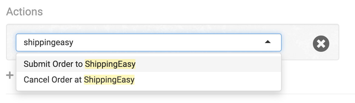 ShippingEasy also supports specific rule actions that you can apply to your orders. To find them, search for shippingeasy in the Actions dropdown: