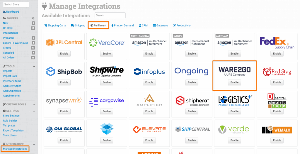 To connect to Ware2Go, click on the Manage Integrations link in the left sidebar and under the Fulfillment tab find and enable the Ware2Go integration.