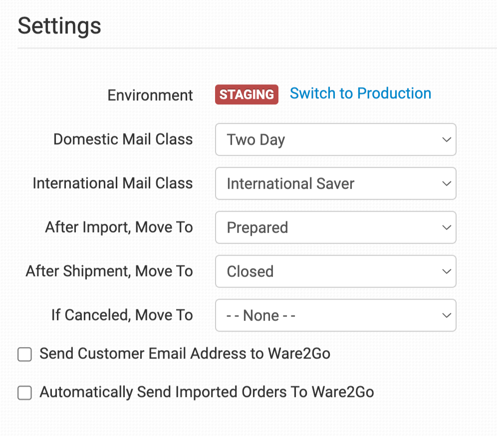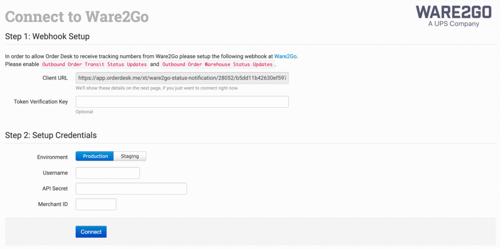 After choosing either a Production (live) or Staging (test) environment, enter your Username, API Secret, and Merchant ID. Please note that Order Desk is unable to recover your credentials as this information must be supplied by Ware2Go. More information on setting up a Ware2Go account and acquiring credentials can be found here.