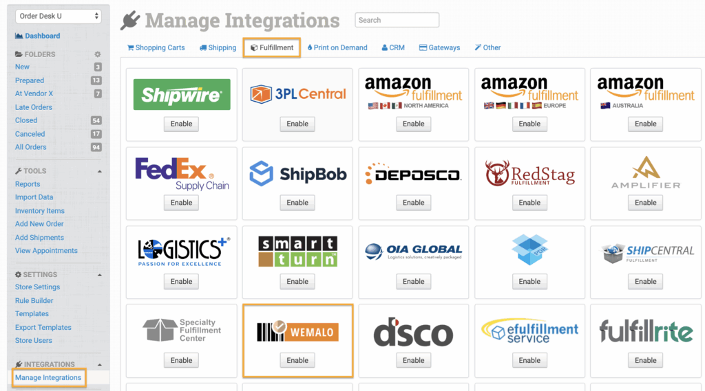 To connect to Wemalo, click on the Manage Integrations link in the left sidebar and under the Fulfillment tab find and enable the Wemalo integration.
