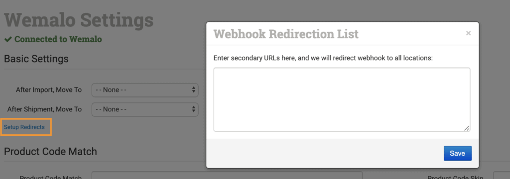 In your primary store, where the first connection to Wemalo was made, you will see Setup Redirects. Click this link to open your Webhook Redirection List. Then, in your other Order Desk stores that are also connected to the same Wemalo account, find the Notification URL: