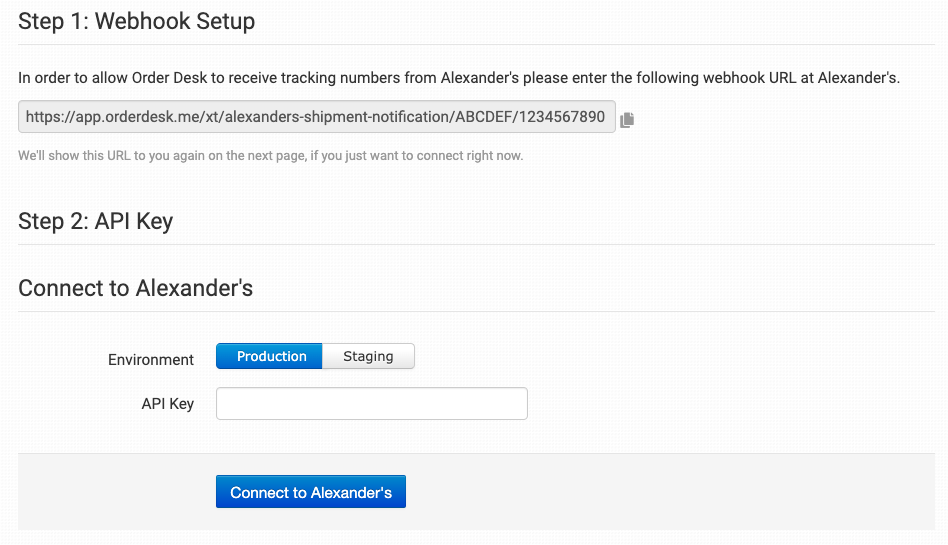 Copy the provided webhook URL and add it to your account at Alexander’s, then choose either a Production or Staging environment and enter your API Key to complete the connection.