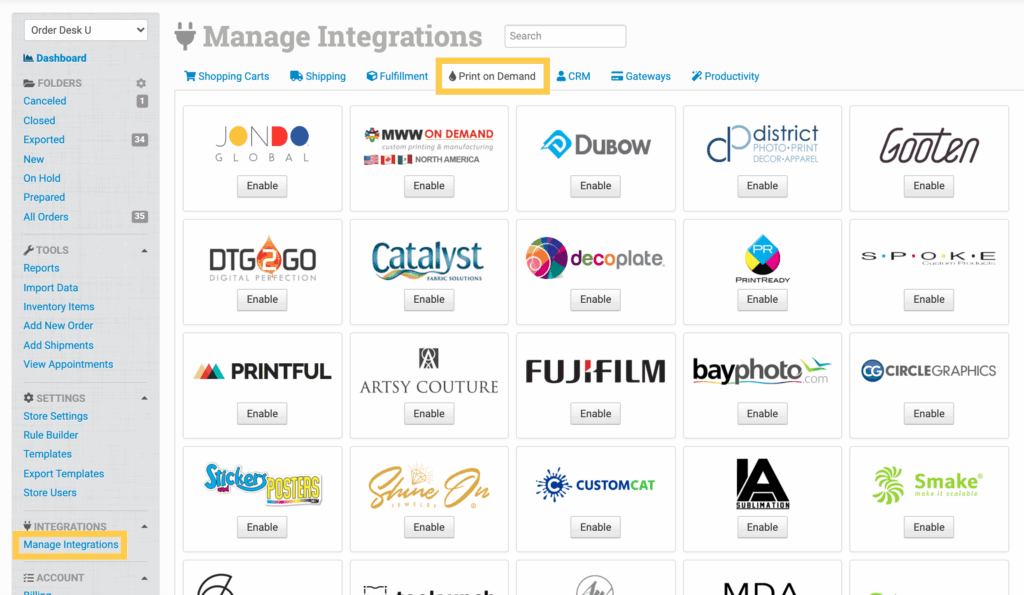 To connect to Alexander’s, click on the Manage Integrations link under the Integrations menu in the left sidebar, and under the Print on Demand tab find and enable Alexander’s.