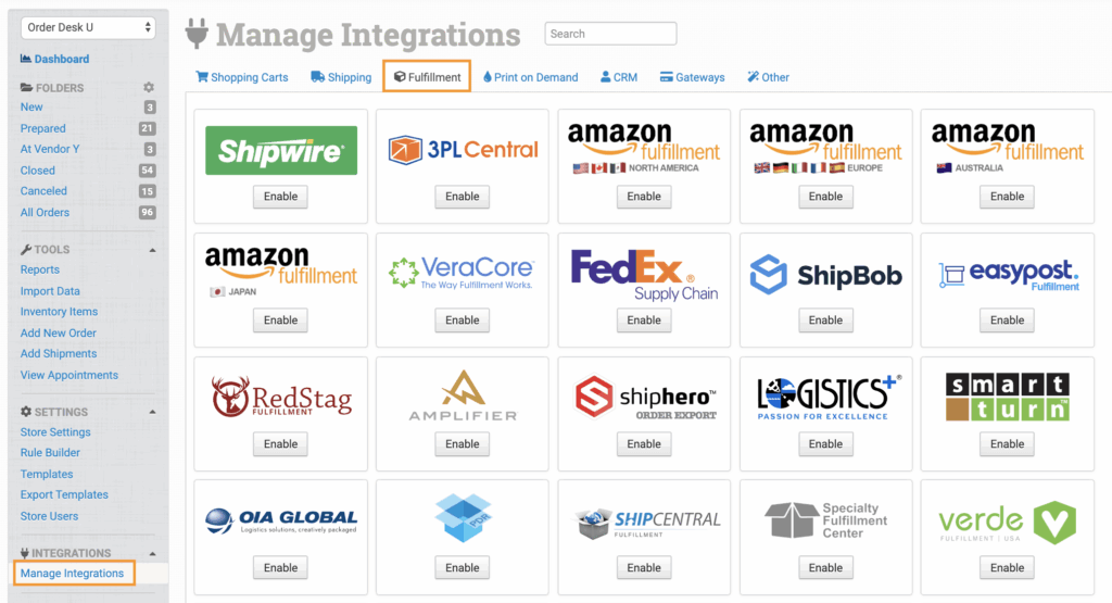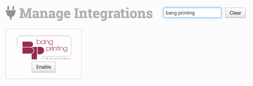 To connect to Bang Printing, click on the Manage Integrations link in the left sidebar and under the Fulfillment tab find and enable the Bang Printing integration.