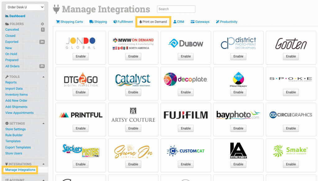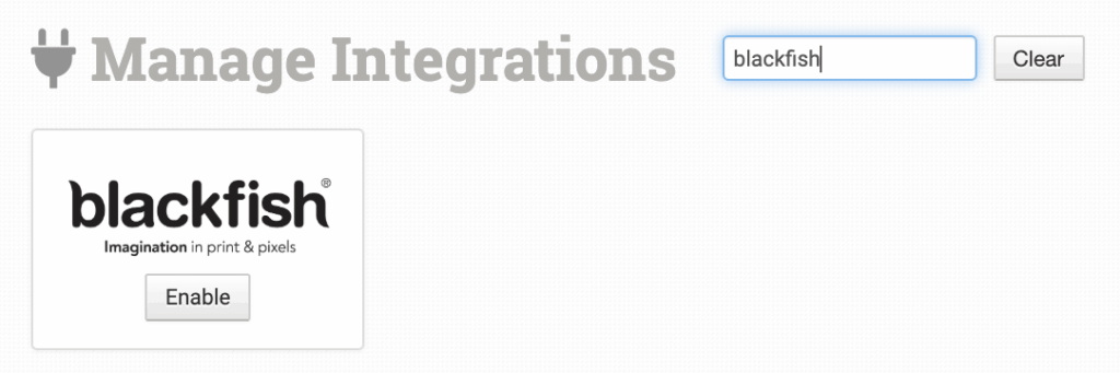 To connect to Blackfish, click on the Manage Integrations link under the Integrations menu in the left sidebar, and under the Print on Demand tab find and enable Blackfish.