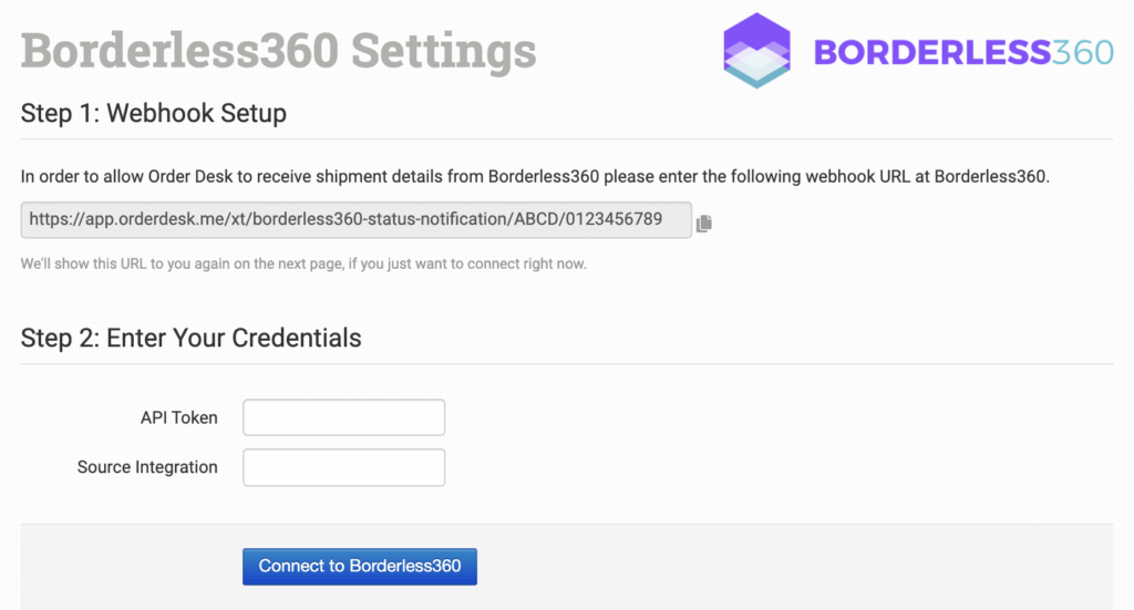 If you skipped this step when connecting the integration, add this webhook URL to your Borderless360 account. This is necessary for Borderless360 to be able to send shipment notifications back into your orders in Order Desk.