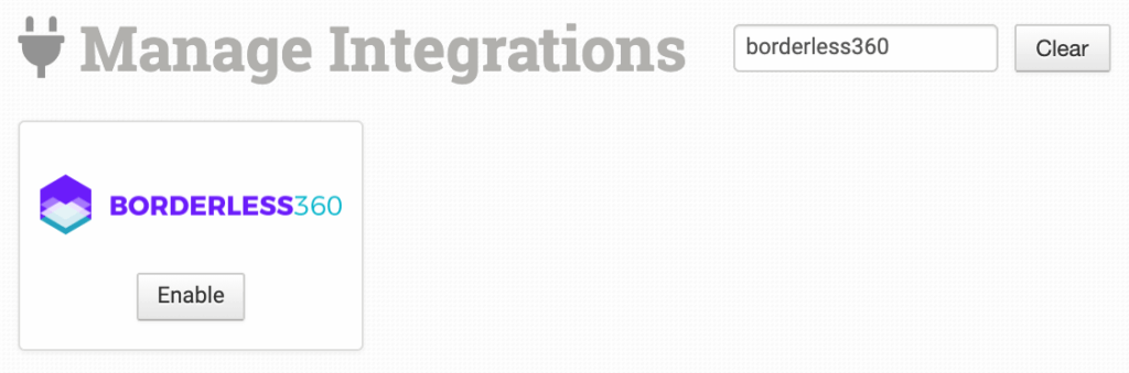 To enable the integration, click on the Manage Integrations link in the Integrations menu in the left sidebar. Under the Fulfillment tab, find and enable Borderless360.