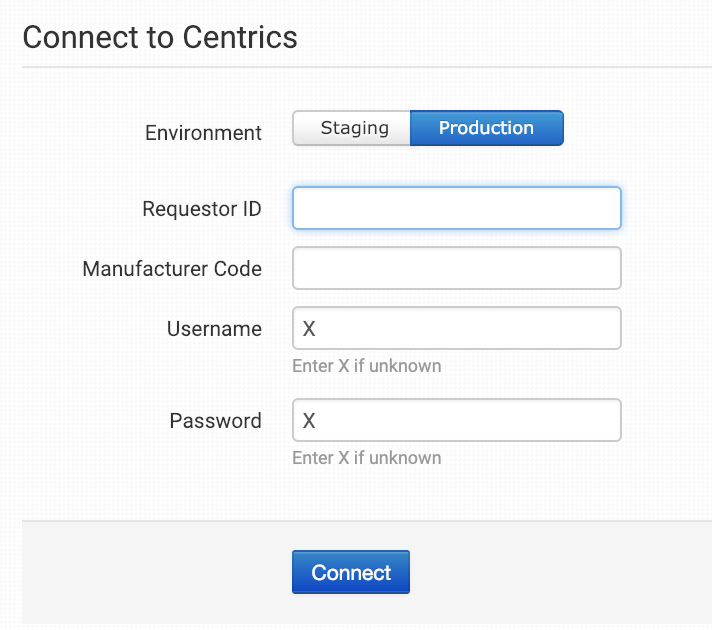 Select the environment for your connection, which should be Staging initially for the testing phase, and later can be switched to Production for sending live orders to your printer. Enter the Requestor ID and Manufacturer Code provided to you by your provider and click to connect.