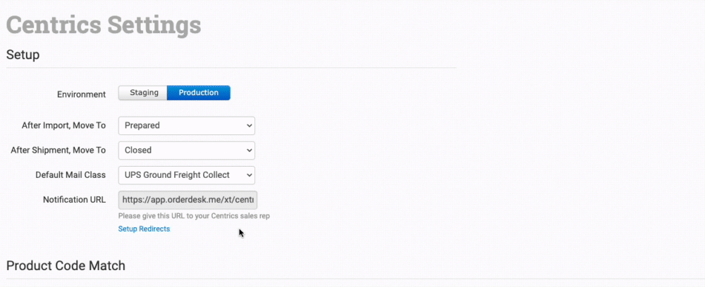 If you have Centrics connected to more than one Order Desk store for the same Centrics account, instead of adding the notification URL for each connection to Centrics, add any additional notification URLs from other connections to your primary account. To add these, click on Setup Redirects. Add one URL per line.