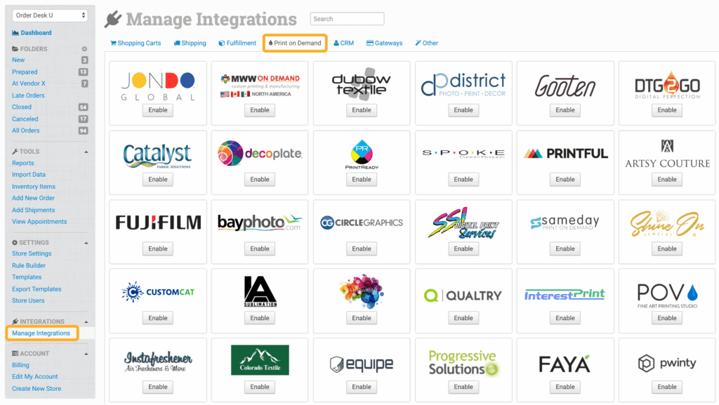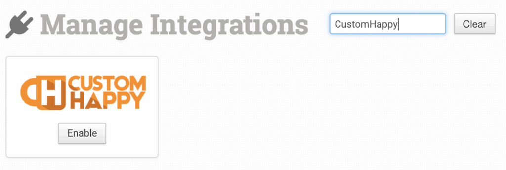 To connect to CustomHappy, click on the Manage Integrations link under the Integrations menu in the left sidebar, and under the Print on Demand tab find and enable CustomHappy.