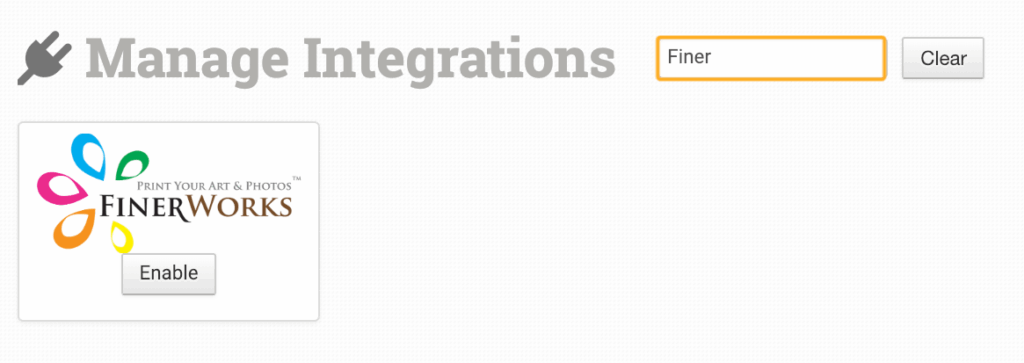 To enable the integration, click on Manage Integrations in the left sidebar. Under the Print on Demand tab, find and enable the FinerWorks integration.