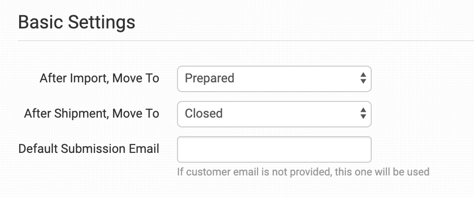 Enter the email address to be used on orders where the customer hasn’t provided one. The email field is required, so if this is left blank and an email is not on the order, the order will fail to submit to FotoCadeau.