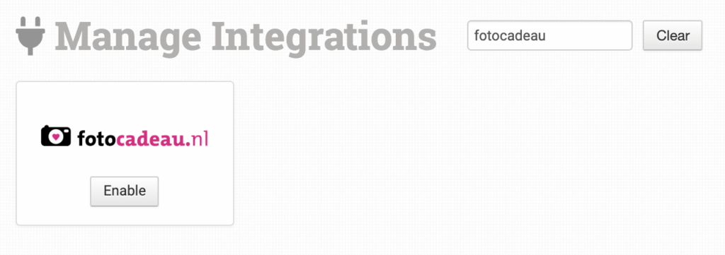 To connect to FotoCadeau, click on the Manage Integrations link under the Integrations menu in the left sidebar, and under the Print on Demand tab find and enable FotoCadeau.