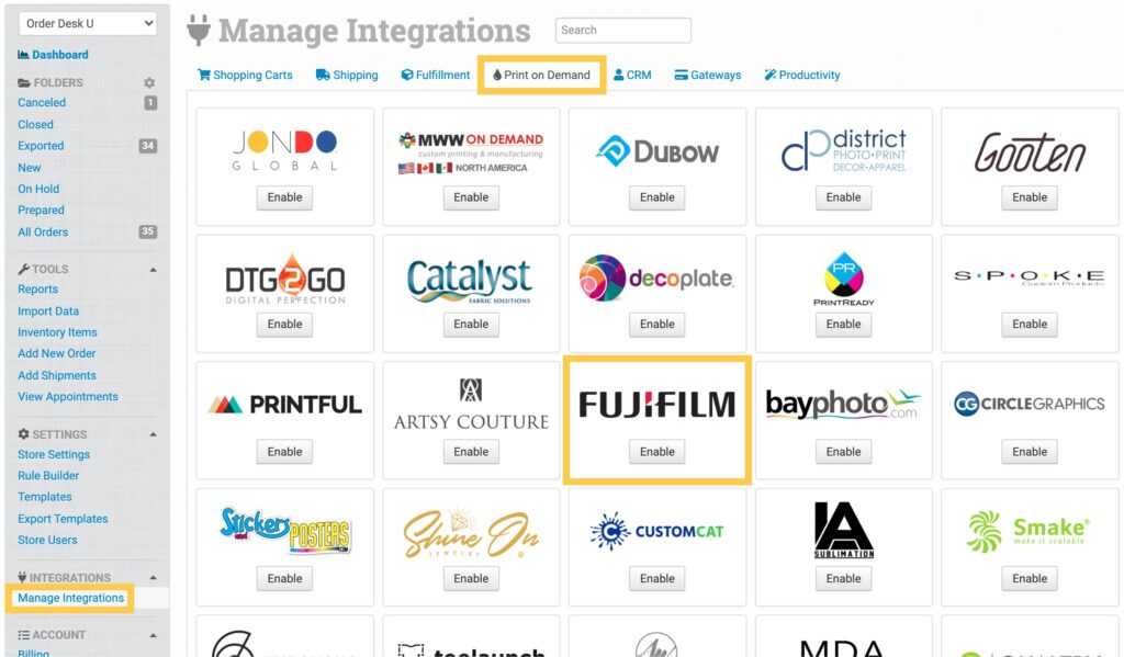 To enable the integration, click on Manage Integrations in the left sidebar. Under the Print on Demand tab, find and enable the Fujifilm integration.