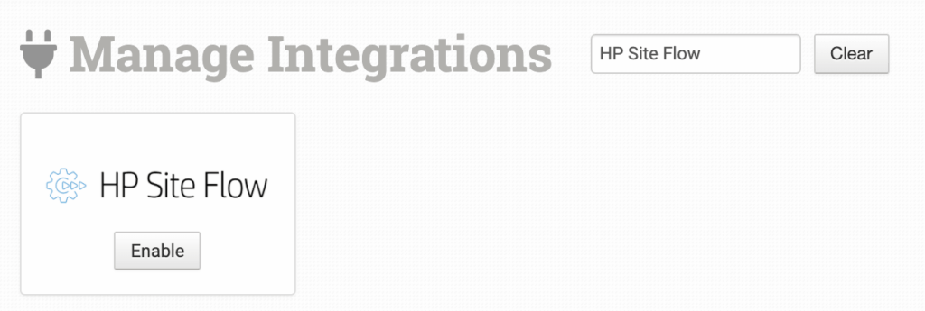 To connect to HP Site Flow, click on the Manage Integrations link in the left sidebar. Under the Print on Demand tab find and enable HP Site Flow.