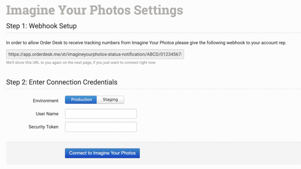 Once enabled, give your webhook URL to your Imagine Your Photos account rep, then enter your Imagine Your Photos credentials and click to connect. Both Production and Staging environments are supported.