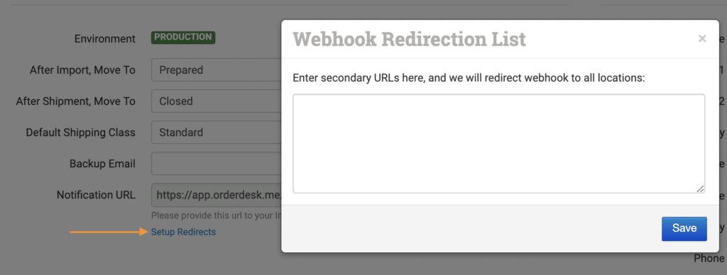 Copy this URL and paste it into the Setup Redirects field in your main store. Add one URL per line, making sure all notification URLs from your other Order Desk stores are included.