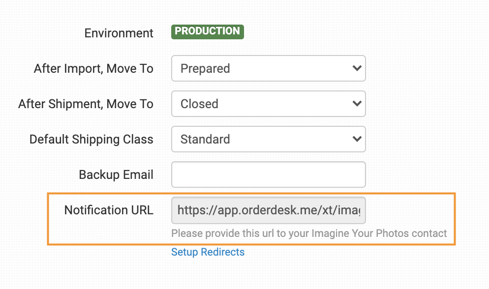 In your primary store, where the first connection to Imagine Your Photos was made, you will see Setup Redirects. Click this link to open your Webhook Redirection List. Then, in your other Order Desk stores that are also connected to the same Imagine Your Photos account, find the Notification URL:
