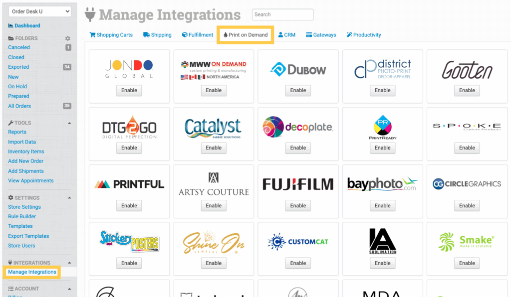 To connect to JONDO UK, click on the Manage Integrations link in the left sidebar. Under the Print on Demand tab find and enable JONDO UK.