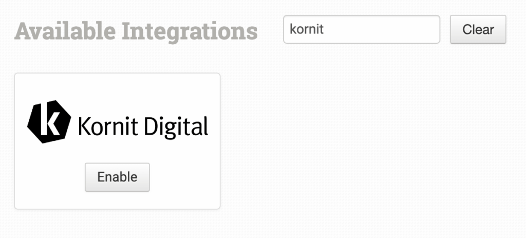 To connect to Kornit, click on the Manage Integrations link under the Integrations menu in the left sidebar, and under the Print on Demand tab find and enable Kornit.
