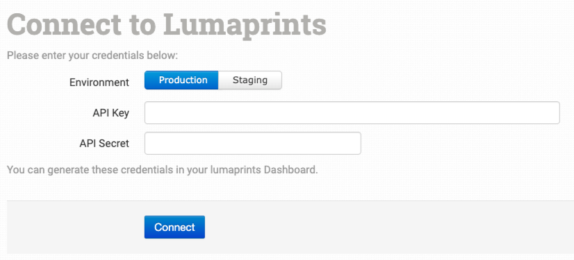 Select your Environment, enter your Lumaprints credentials, and click to connect: