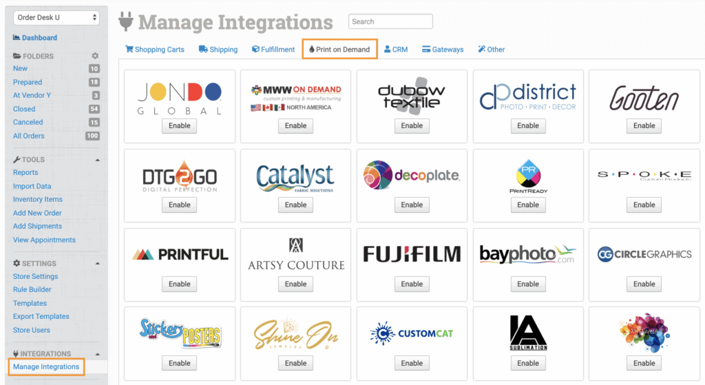 To connect to your Monster Digital account, click on Manage Integrations in the left sidebar. Under the Print on Demand tab, look for and enable the Monster Digital integration.