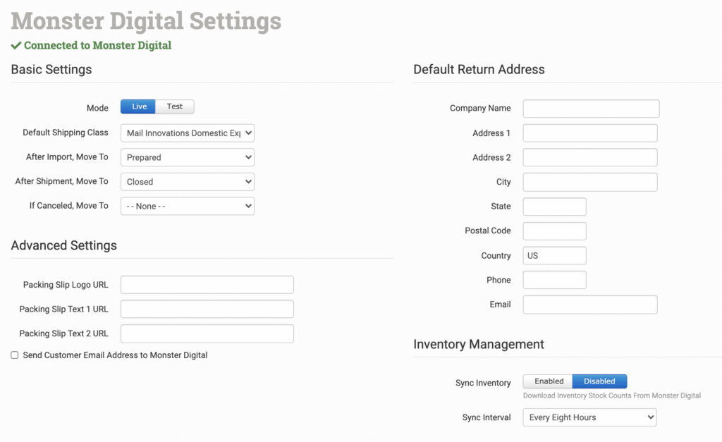 If you need to customize the return address for certain orders, you can save different return addresses to your Store Settings and then use a rule to set the return address to specific orders. If a return address is not added to the order, the default address set here in the Monster Digital settings will be used.