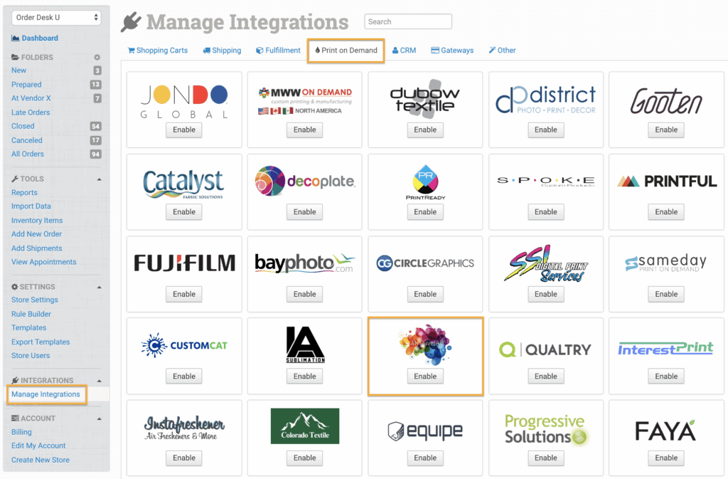To connect to My Direct Art, click on Manage Integrations in the left sidebar. Under the Print on Demand tab, find and click to enable the My Direct Art integration.