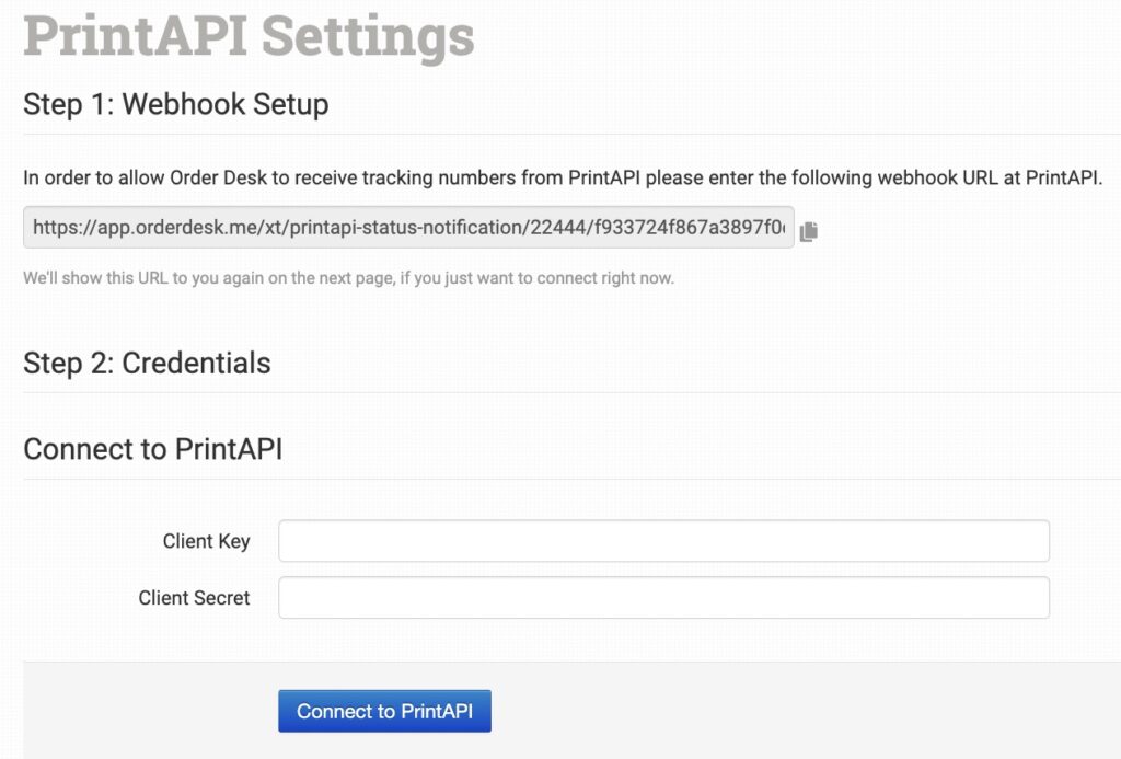Copy your webhook URL over to your settings at PrintAPI, enter your PrintAPI credentials, then click to connect: