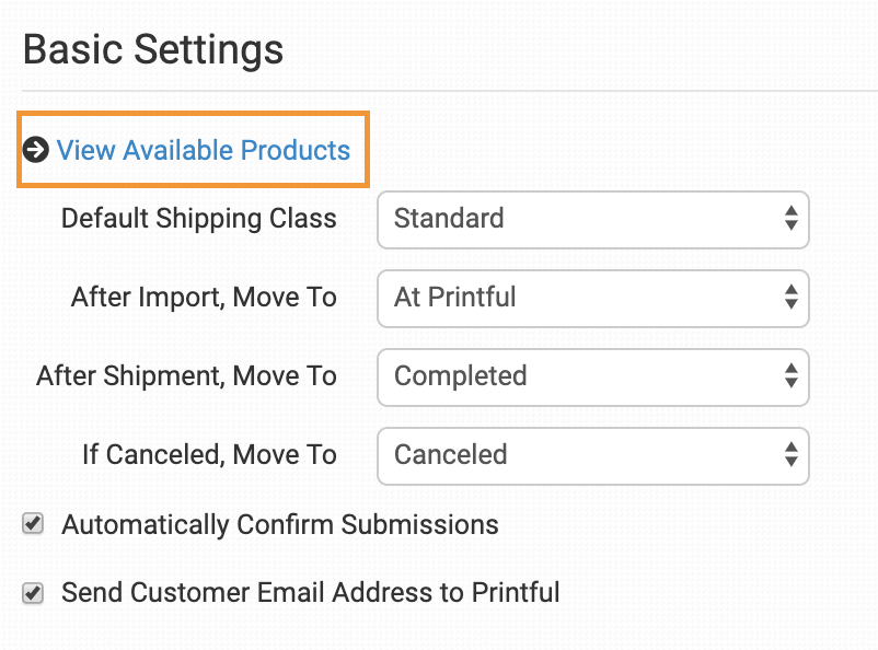 The print_sku is the Variant ID, which can be found in Printful’s product list. To find this, click the View Available Products link at the top of the integration settings: