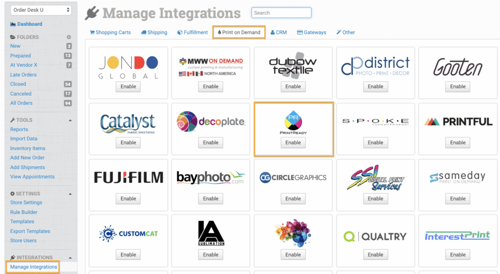 To enable the integration, click on Manage Integrations in the left sidebar. Under the Print on Demand tab, find and enable the PrintReady integration.