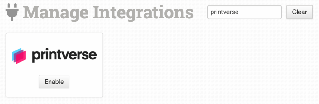 To connect to your Printverse account, click on Manage Integrations in the left sidebar. Under the Print on Demand tab, look for and enable the Printverse integration.