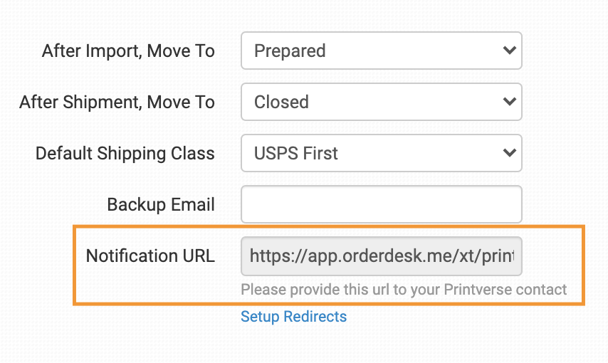 In your primary store, where the first connection to Printverse was made, you will see  Setup Redirects. Click this link to open your Webhook Redirection List. Then, in your other Order Desk stores that are also connected to the same Printverse account, find the Notification URL: