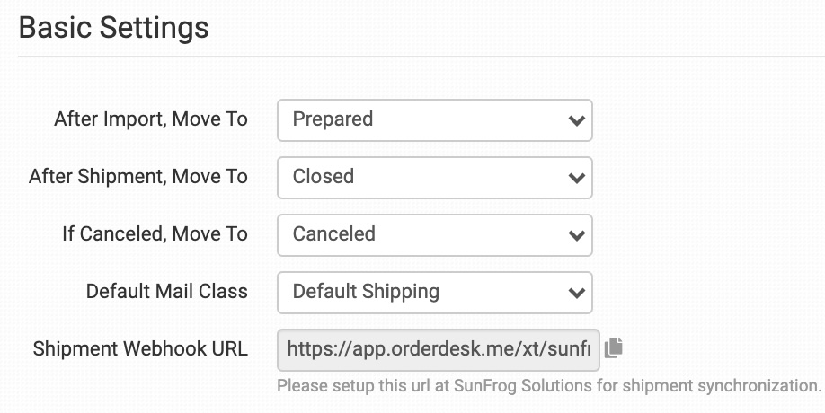 The Shipment Webhook URL is how SunFrog Solutions tells Order Desk about your order shipments. This URL must be set up at SunFrog Solutions for Order Desk to automatically pull in tracking details on orders sent to SunFrog.