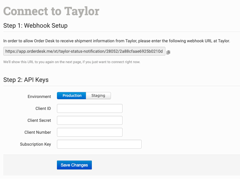 To finish connecting, choose your Environment (Production for live orders and Staging for test orders) and enter your Taylor API Keys and click Save Changes: