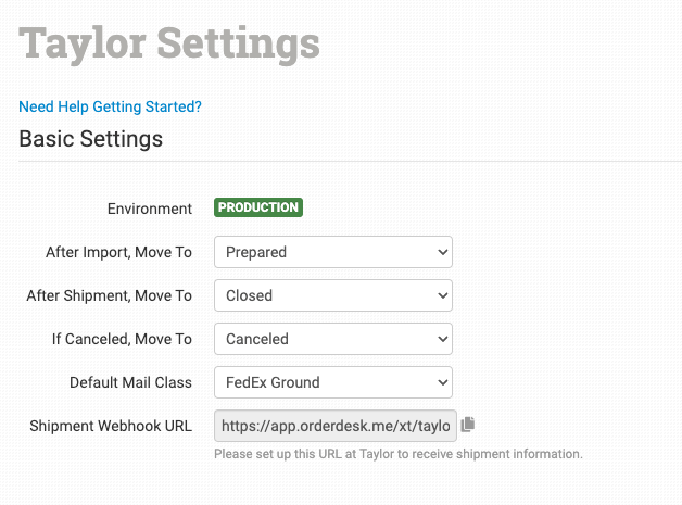 Once you’ve enabled the integration, you’ll be presented with a webhook that will need to be entered in your Taylor account to allow Order Desk to receive shipment information for your orders. This link will also be available in the integration settings at the next step.