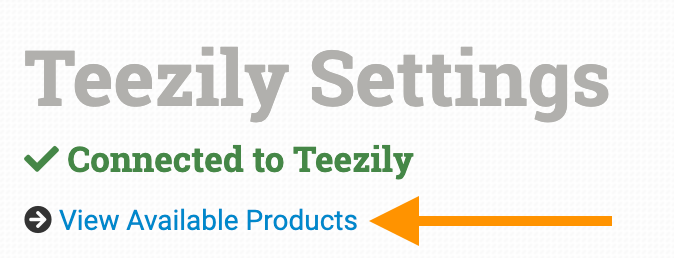 Teezily requires some details about each item being ordered for them to know what to fulfill. To find the IDs and variant information for each item, click the View Available Products link at the top of the integration settings page to view the product catalog.