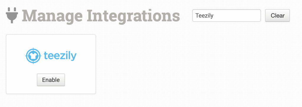 To connect to Teezily Plus, click on the Manage Integrations link under the Integrations menu in the left sidebar, and under the Print on Demand tab find and enable Teezily.