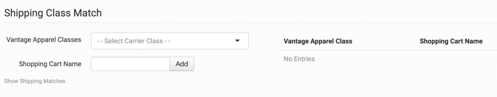To tell Vantage Apparel what methods you want them to use, you will need to match your method names to theirs. This can be done in the shipping class match section. For detailed instructions on setting this up, please read through the shipping class match guide.
