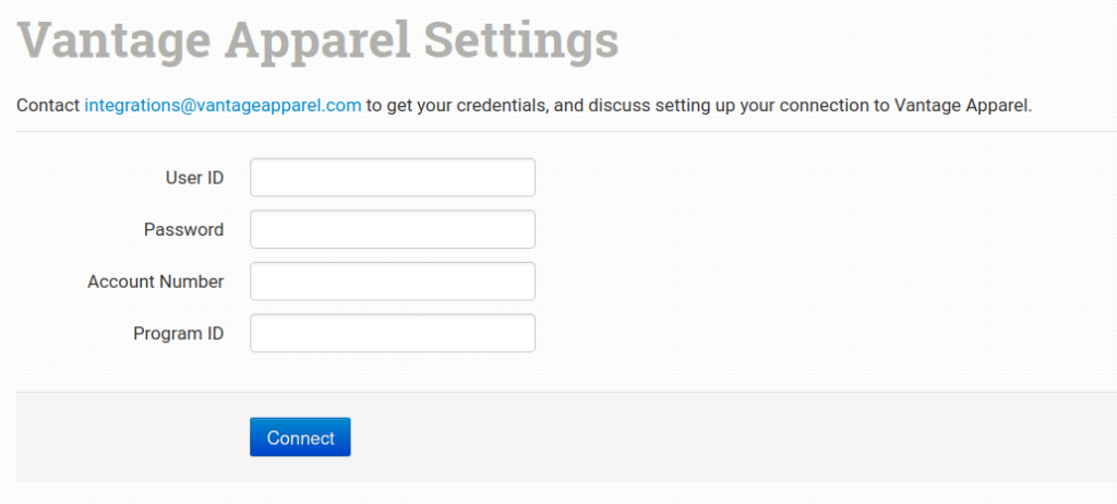 Enter your Vantage Apparel credentials, then click to connect:
