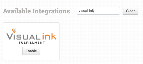 To connect to Visual Ink, click on the Manage Integrations link under the Integrations menu in the left sidebar, and under the Print on Demand tab find and enable Visual Ink.