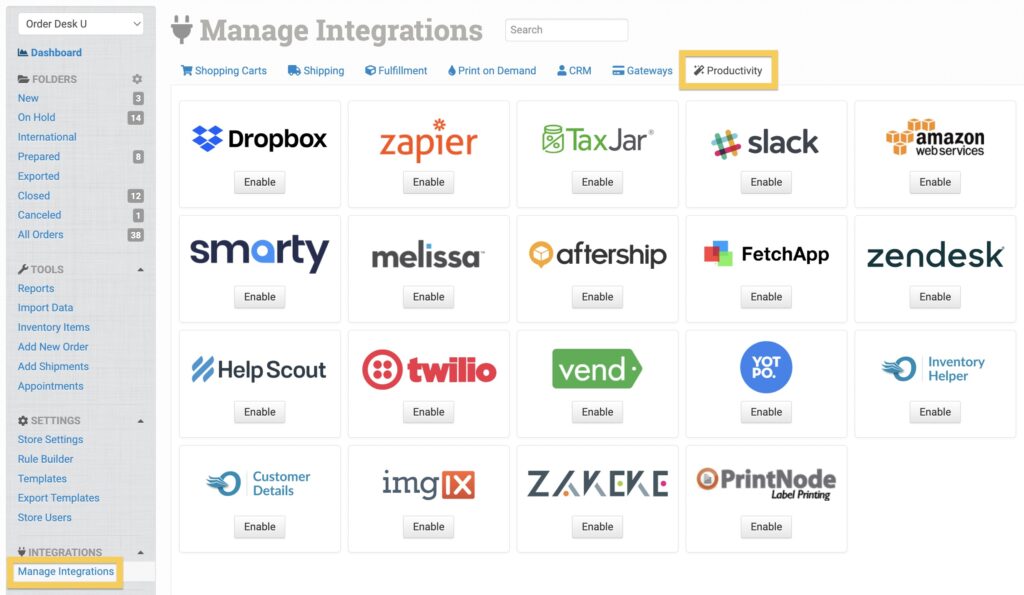 In Order Desk, click on Manage Integrations under the Integrations menu in the left sidebar. Under the Productivity tab, find and enable Amazon Web Services.