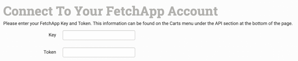 Enter your FetchApp Key and Token, then click to connect. These can be found in FetchApp from the cart menu at the bottom to the API section.