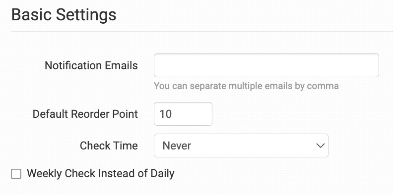 If the Default Reorder Point field is empty, alerts will only be sent on inventory items that have the reorder_point metadata.