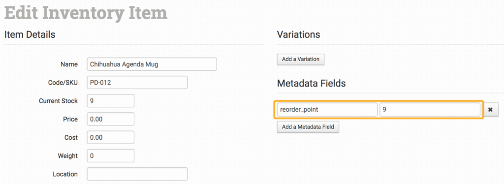 If you need to set individual reorder points on specific products, you can do so with item metadata called reorder_point. Set the number for each individual item if different from the default reorder point.