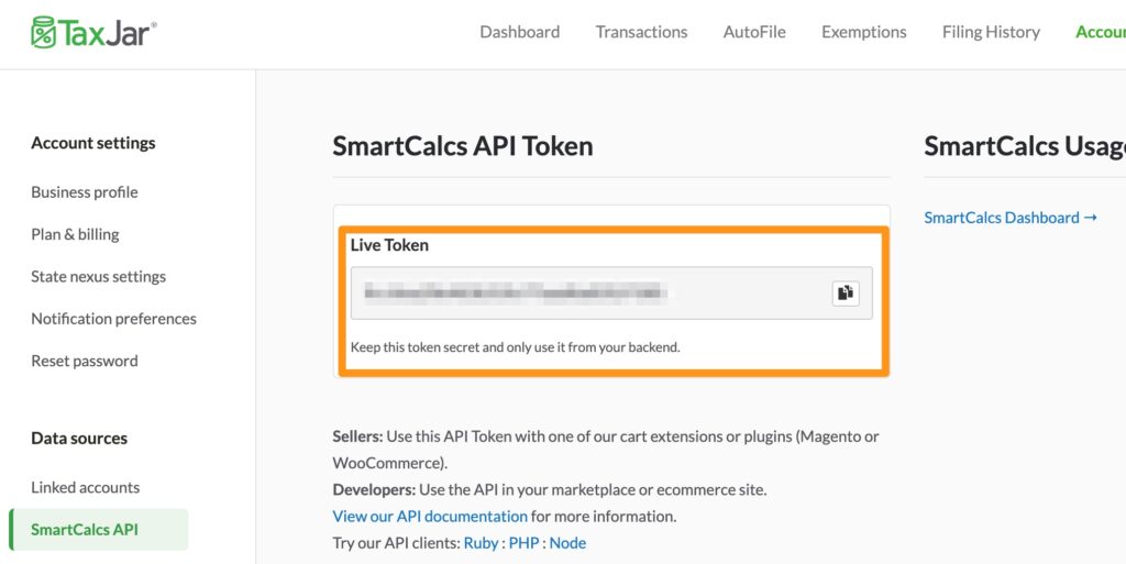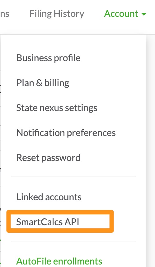 To find your API Key at TaxJar, click on Account > SmartCalcs API.