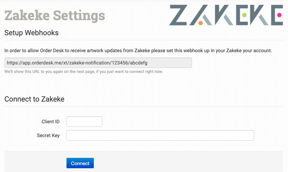 Enter your Zakeke Client ID and Secret Key then click to connect.