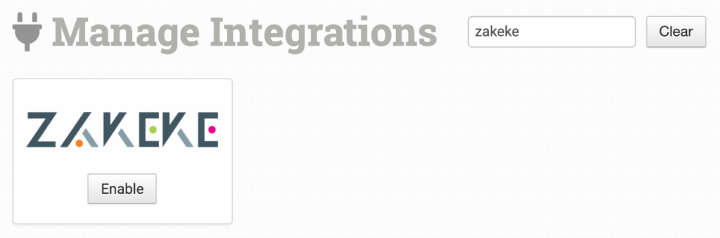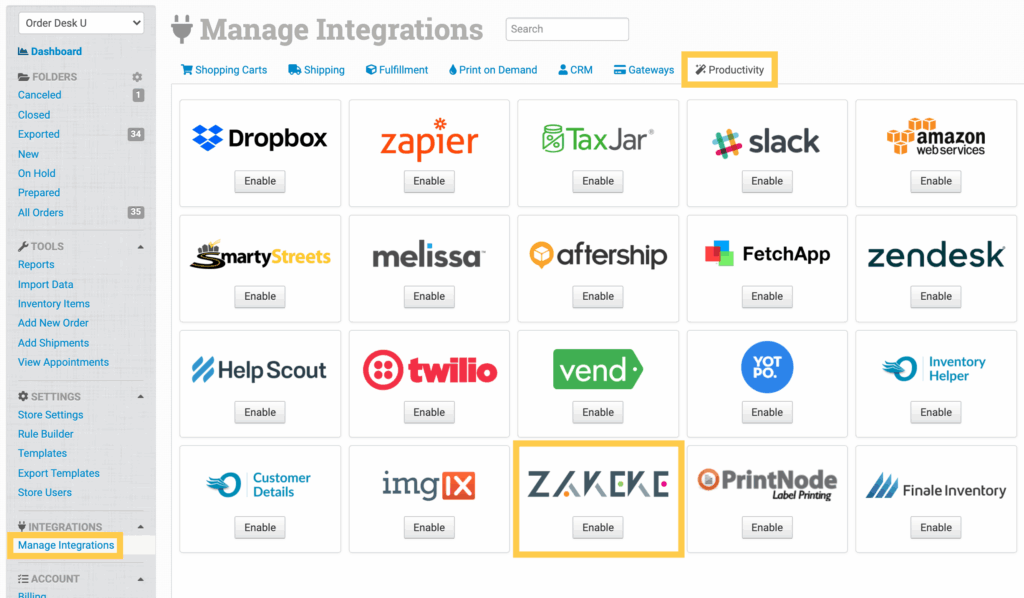 To enable the integration, click on Manage Integrations in the left sidebar. Under the Productivity tab, find and enable the Zakeke integration.