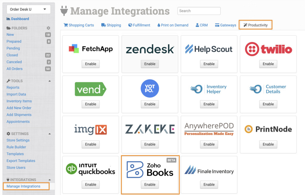 To enable the integration, click on Manage Integrations from the left sidebar in Order Desk. Under the Productivity tab, find and enable Zoho Books.